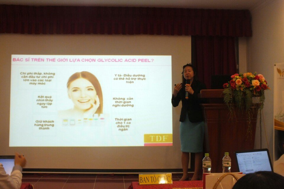Tại Hội thảo, bà Phạm Thương Tuyền Loan chia sẻ với các chị em phụ nữ về tính năng và tác dụng của qui trình Chemical peel bằng Glycolic Acid trong chăm sóc trị liệu nám da, sẹo mụn trứng cá, những thay đổi sắc tố trên da và các liệu trình trẻ hóa da.