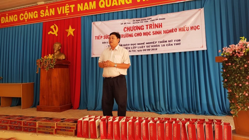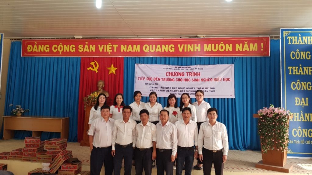 Sáng ngày 04/8/2018, tại UBND xã An Tức, huyện Tri Tôn, tỉnh An Giang, Trung tâm GDNN Thẩm mỹ FOB phối hợp cùng các thành viên lớp luật sư K18 Cần Thơ, UBND xã An Tức tổ chức trao quà cho học sinh nghèo hiếu học có hoàn cảnh khó khăn. Đến tham dự có Cô Nguyễn Thị Thơm, Học Viện Tư pháp; Tiến sĩ Huỳnh Văn Tùng, Phó Viện trưởng Viện Kinh tế – Xã hội TP.Cần Thơ; Thạc sỹ Nguyễn Văn Nguyên, Giám đốc Trung tâm, Các anh chị lớp Luật sư K18 Cần Thơ, cùng quý lãnh đạo UBND xã An Tức, huyện Tri Tôn, tỉnh An Giang.