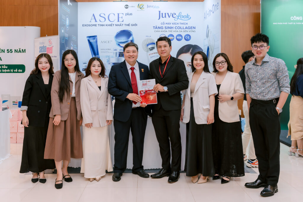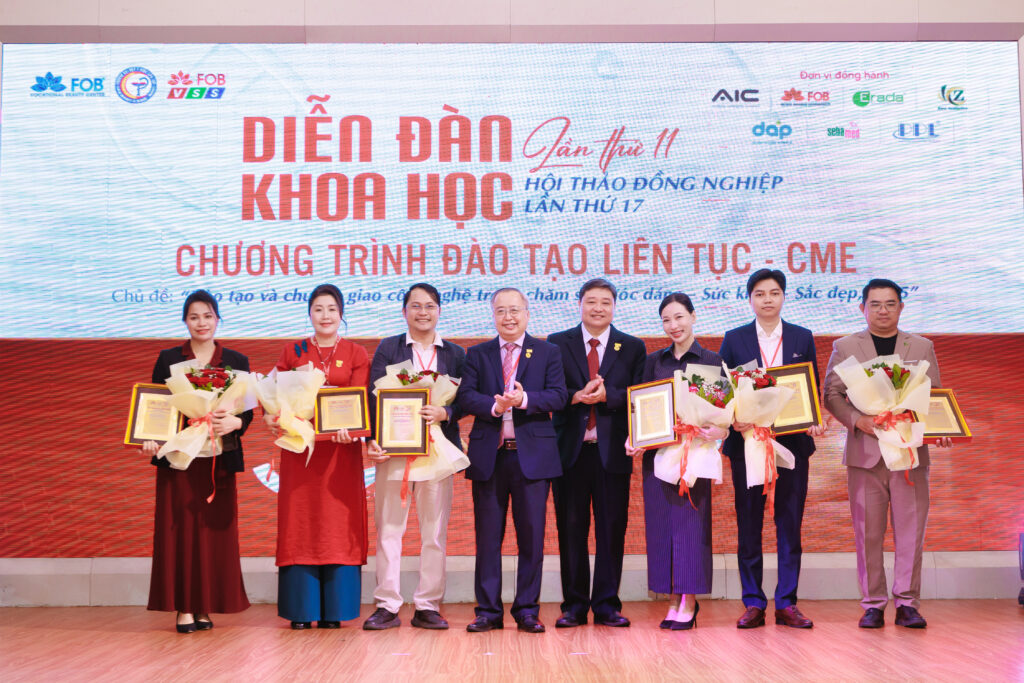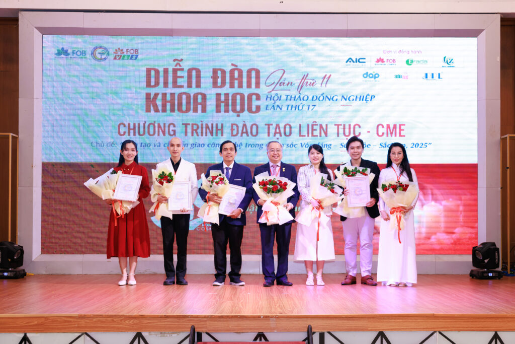 PGS.TS. Huỳnh Văn Bá – Trưởng Bộ môn Da liễu Trường Đại học Y Dược Cần Thơ, Phó Chủ tịch Hội Da liễu Việt Nam (thứ 4 từ trái sang) và TS. Nguyễn Văn Nguyên – Giám đốc Trung tâm Giáo dục Nghề nghiệp Thẩm mỹ FOB (thứ 4 từ phải sang) – Đại diện Ban Tổ chức trao chứng nhận cảm ơn nhà đồng hành