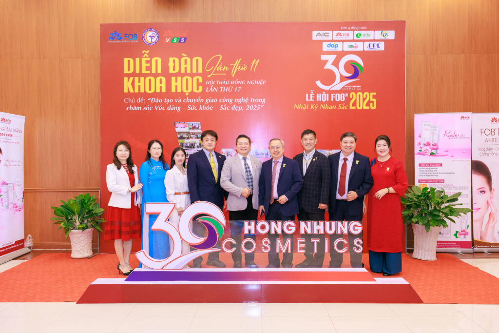 TS. Nguyễn Văn Nguyên – Giám đốc Trung tâm Giáo dục Nghề nghiệp Thẩm mỹ FOB – Ban Tổ chức (thứ 4 từ trái sang) và Ông Đỗ Duy Khánh – Giám đốc Công ty Trách nhiệm Hữu hạn Y tế Thẩm mỹ AIC – Đơn vị đồng hành (thứ 4 từ phải sang) tại sự kiện.