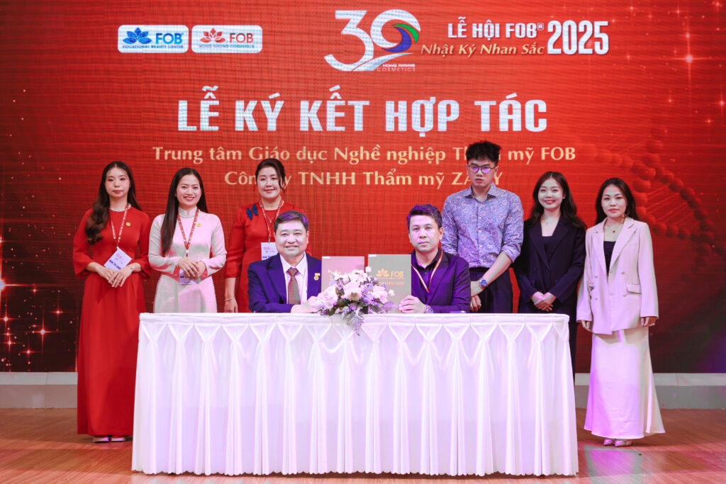TS. Nguyễn Văn Nguyên – Giám đốc Trung tâm Giáo dục Nghề nghiệp Thẩm mỹ FOB (trái) và Ông Trần Kim Khánh – Giám đốc Chi nhánh Công ty Trách nhiệm Hữu hạn Thẩm mỹ ZACY – Tp. Hồ Chí Minh (phải) ký kết hợp tác tại buổi lễ